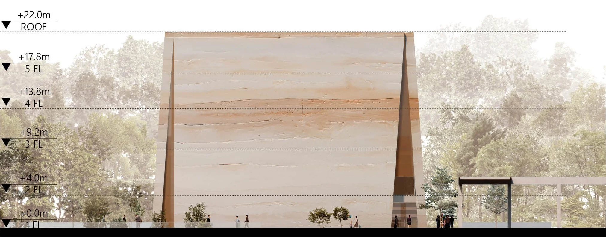 각 파사드는 터파기에서 나온 대지의 흙을 압축해 만든 판넬로 구성되어 있으며, 박물관 자체가 대지의 기록을 그대로 담고 있다.
