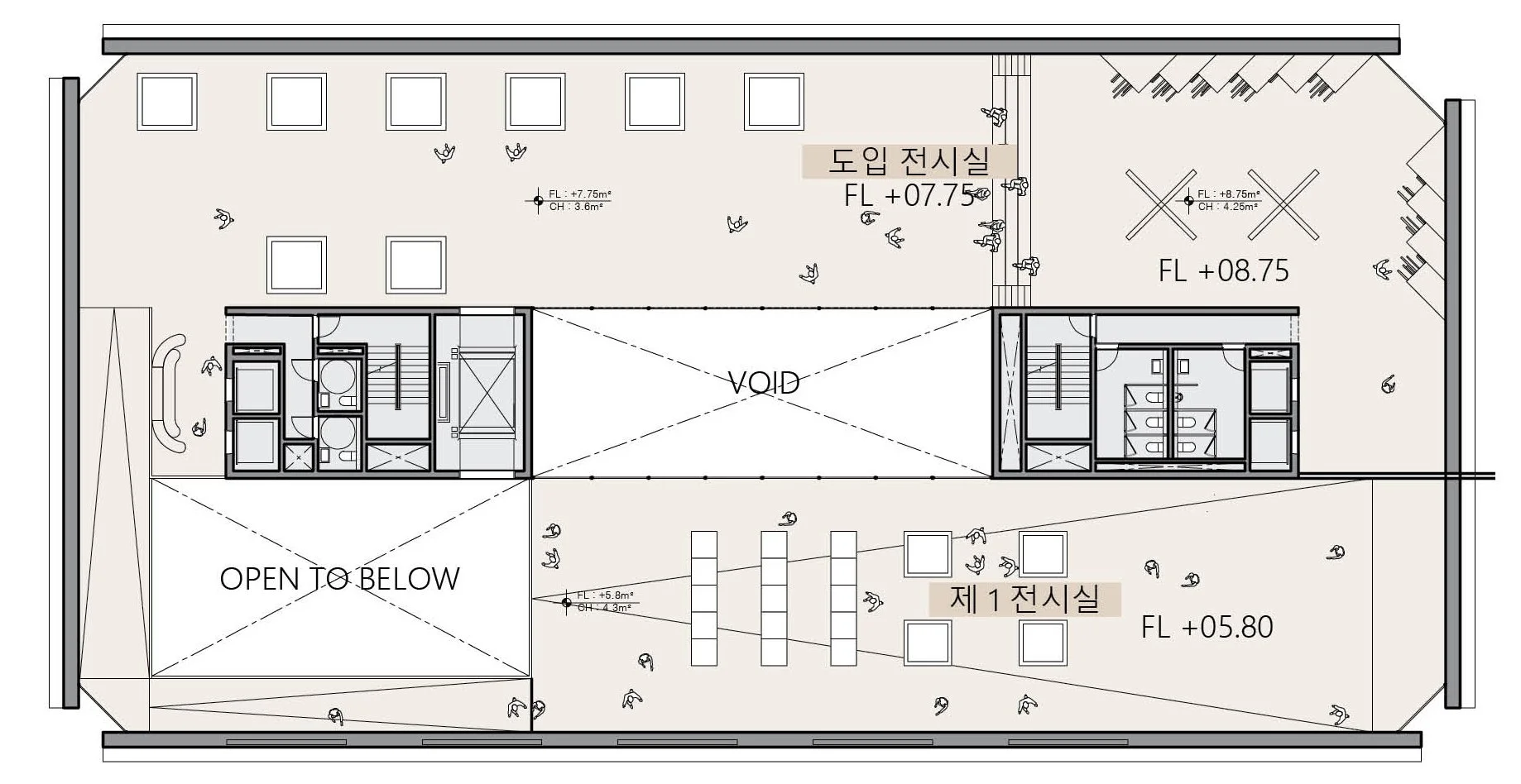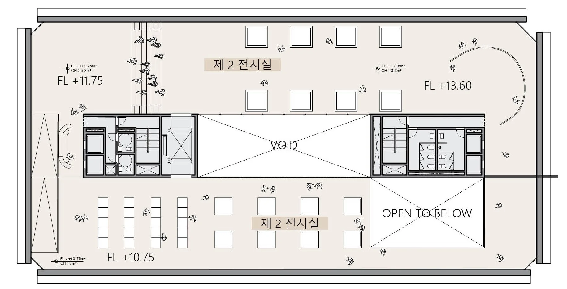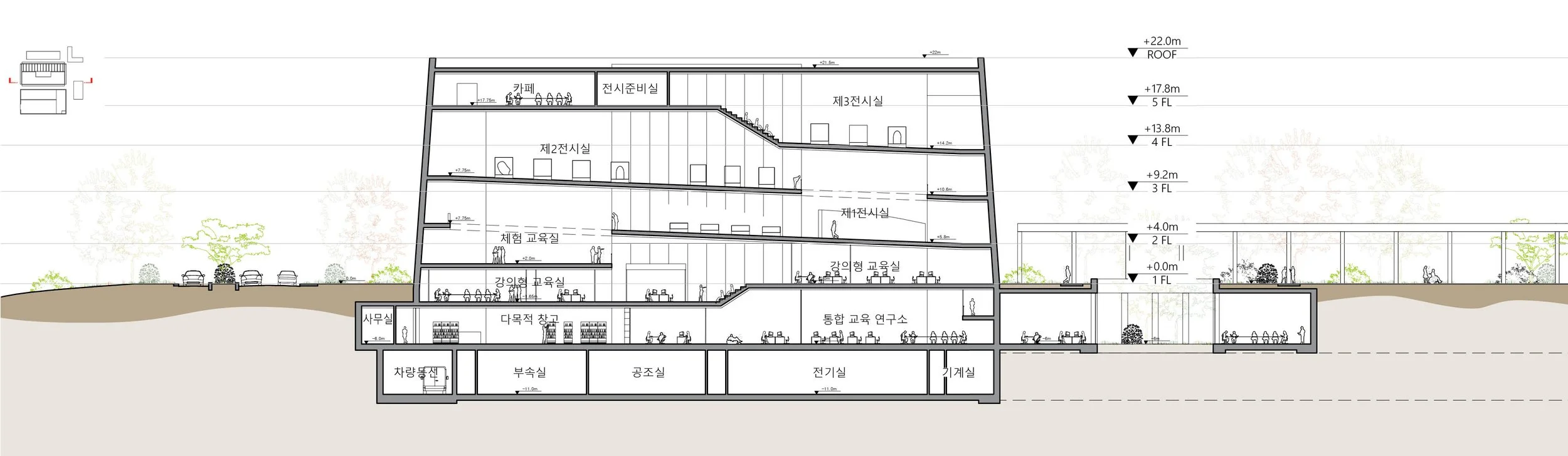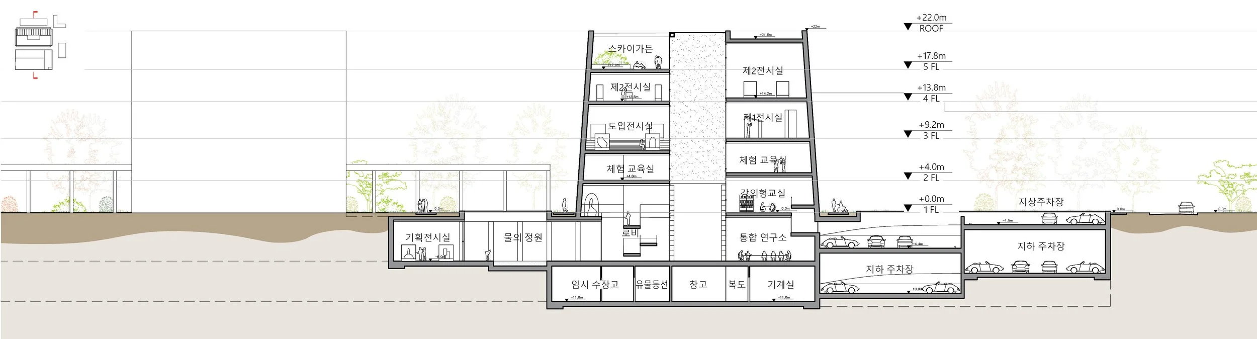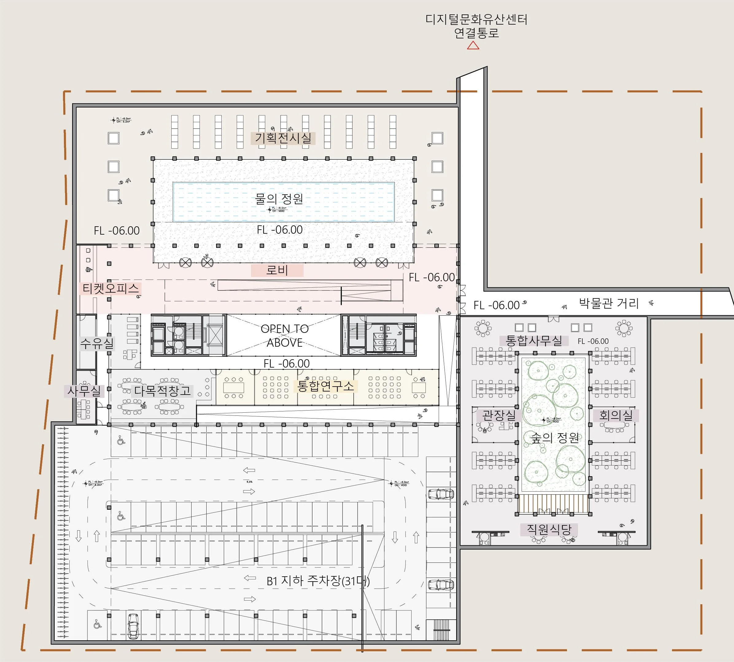 두 개의 선큰 정원과 기록박물관은 주변 박물관의 스케일에 맞춰 설계되었다. 이들은 단지 내에서 연속된 리듬을 주는 볼륨으로 고안되어 전체적인 공간의 조화와 일관성을 유지한다. 이 공간은 두 가지 유형의 선큰 가든을 활용하여 자연광을 도입하고, 건물 내부에 자연 요소를 통합한다. 사무실 쪽에는 숲의 정원이 있으며, B1층 로비 쪽에는 물의 정원이 있다. 이를 통해 각각의 공간이 자연스러운 조명을 받으며, 쾌적하고 조화로운 환경이 조성된다.