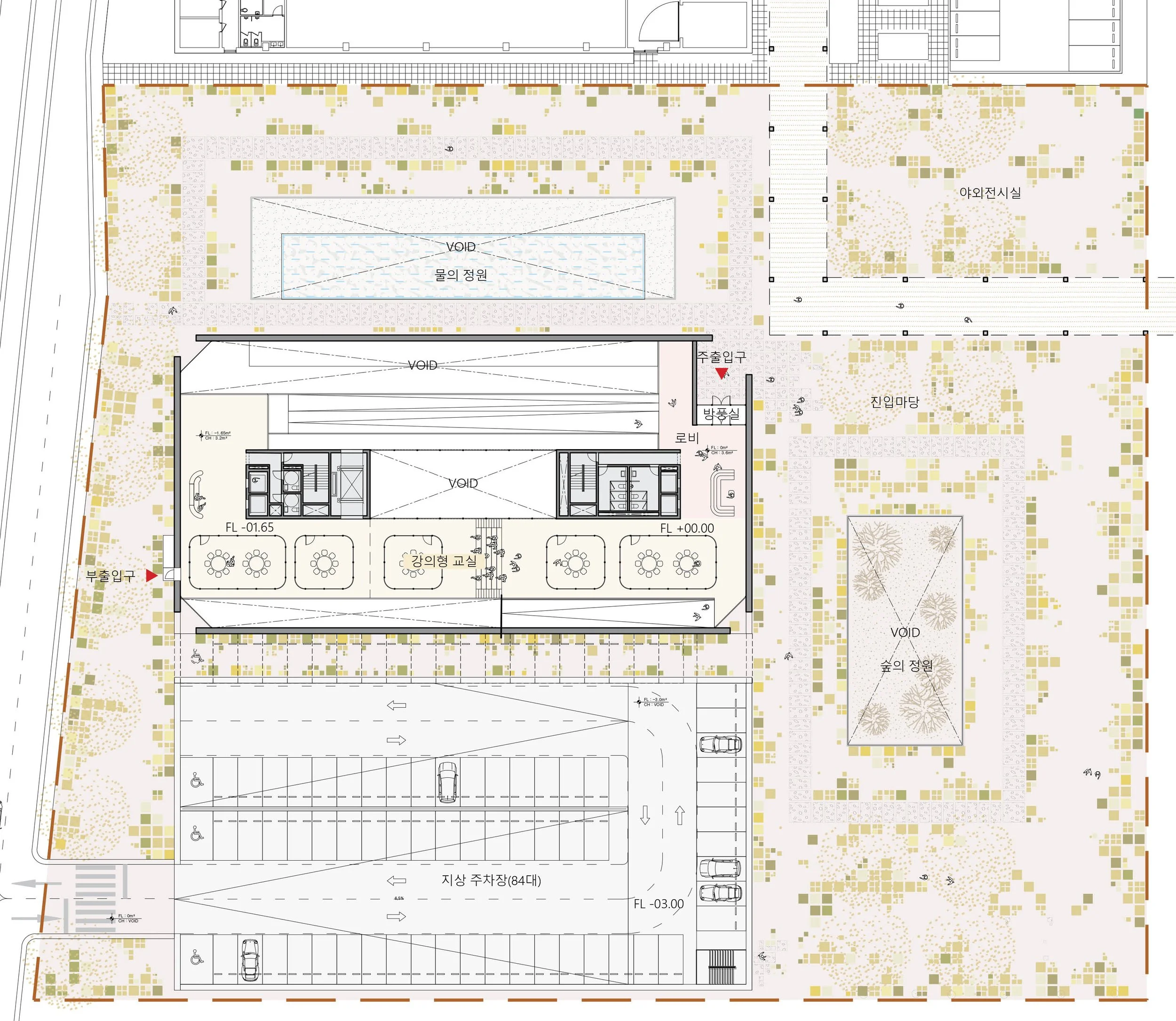 진입마당 내에는 세 개의 선큰 공간이 존재한다. 이 공간은 선큰 형태의 지상주차장과 두 개의 선큰 가든으로 구성되어 있다. 특히, 램프(경사도 7% 이하)로 구성된 선큰형태의 지하주차장은 관람객과 보행자의 시야에서 자동차의 존재감을 줄인다. 이를 통해 방문객들은 오롯이 자연과 박물관에 집중할 수 있게 된다.