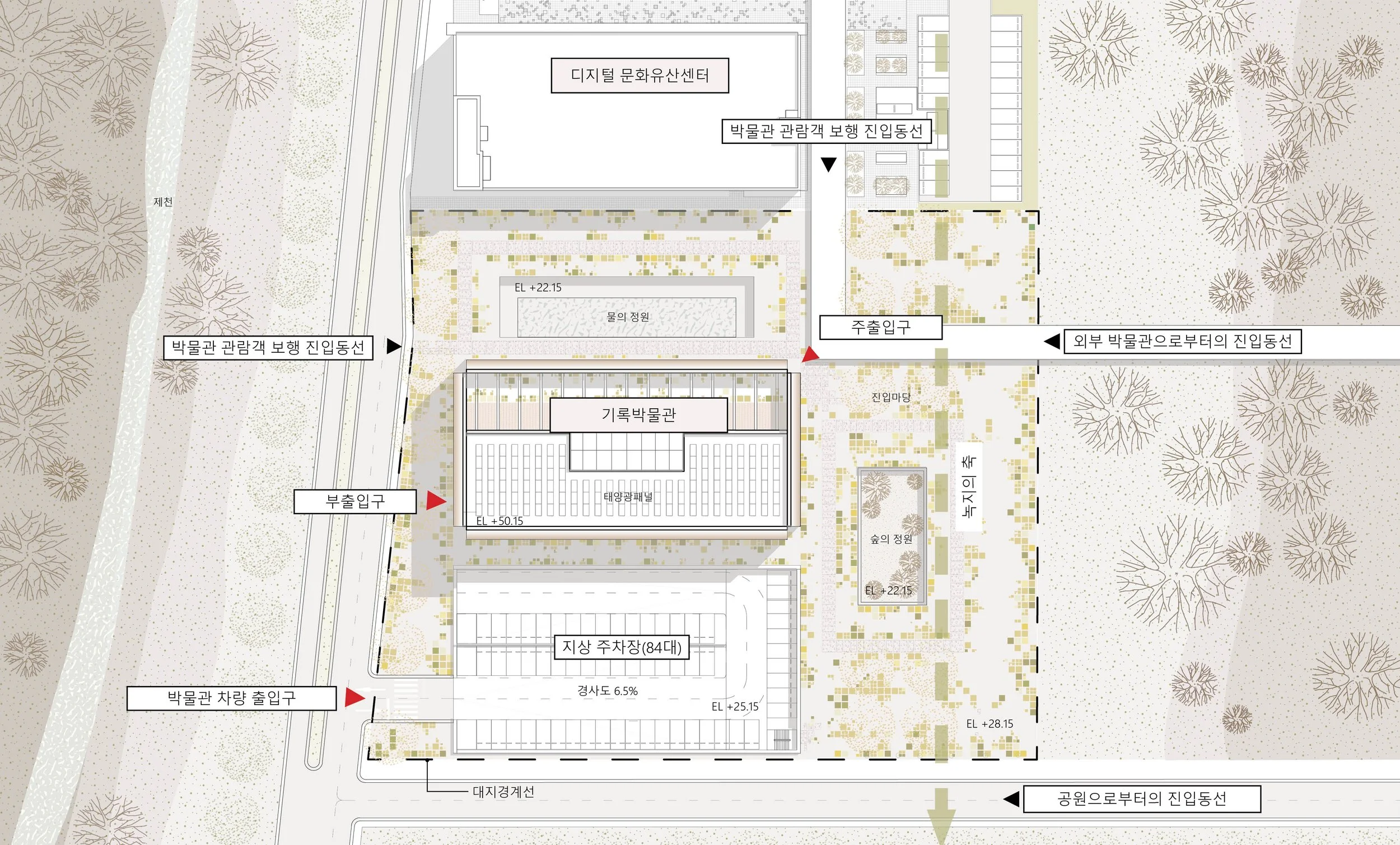캐노피를 따라 기록박물관으로 가는 보행자의 시선에는 금강까지 막힘없이 이어지는 자연의 녹지가 보인다. 이 길은 자연과 조화를 이루며, 보행자에게 평온한 산책길을 제공한다. 기록박물관에 다다르면, 박물관을 둘러싼 넓은 진입마당이 보인다. 자연속의 진입마당은 환영하는 분위기를 조성하며, 방문객들이 편안하게 접근할수 있도록 설계되었다.