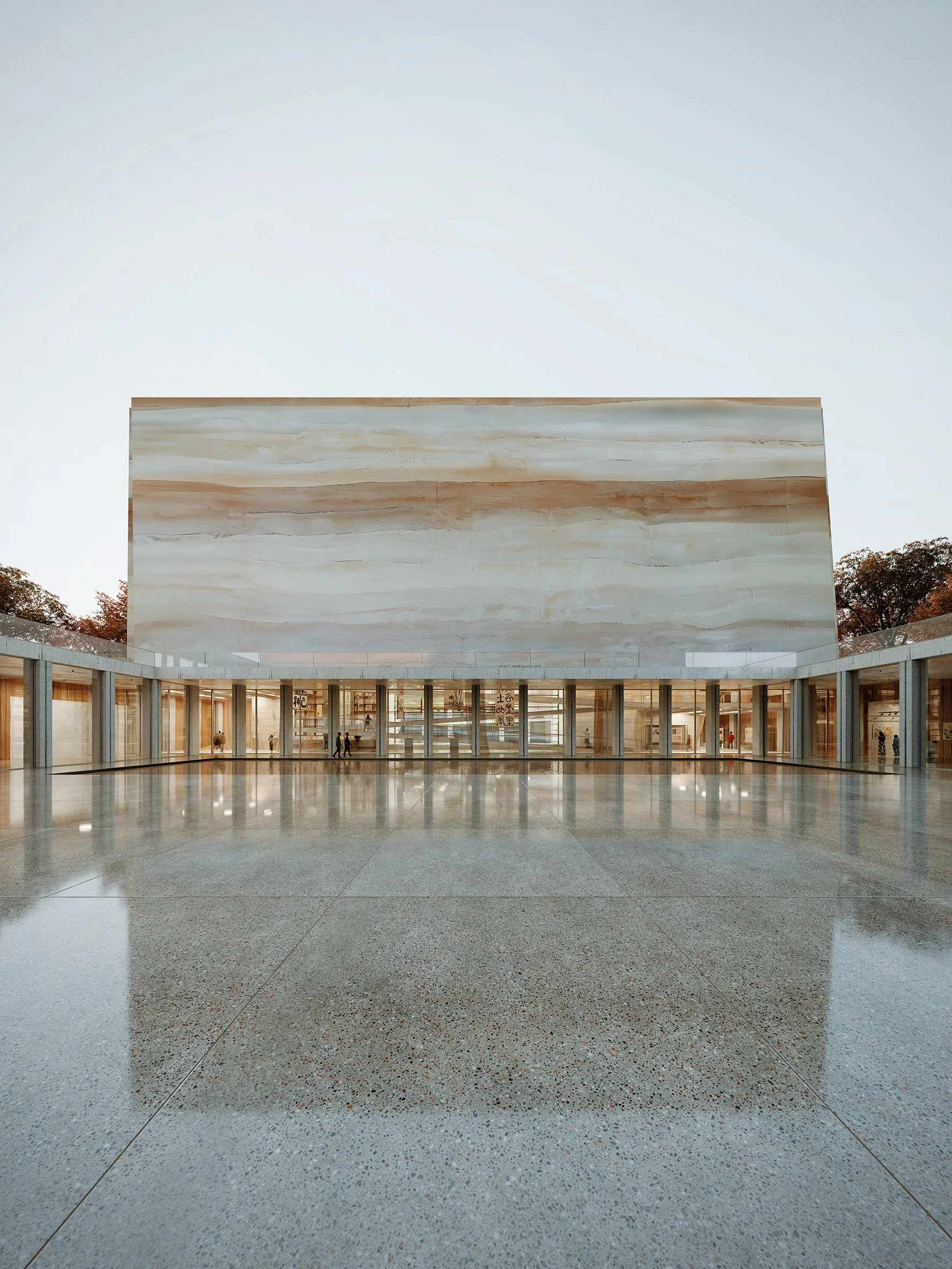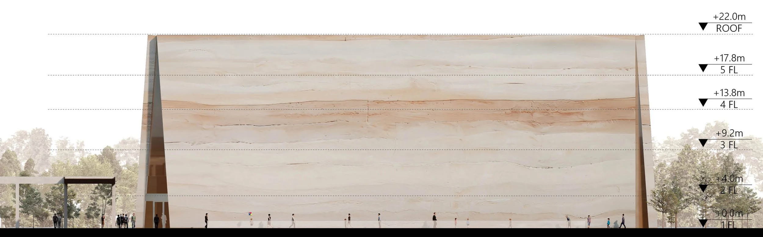 기록 박물관의 설계는 이러한 물질적 유산을 강조한다. 건물의 외벽은 철거된 건물이나 건설 폐기물에서 나온 재료를 재활용하여 만든다. 이렇게 재활용된 재료는 분쇄되어 박물관 벽의 제작에 재사용되며, 지질층이나 대리석을 연상시키는 패턴을 만들어 시간의 축적 과정을 상징한다. 그래서 외벽 자체가 살아있는 기록이 되어, 시간과 물질의 이야기를 전하며, 환경의 변화를 증언하게 된다.